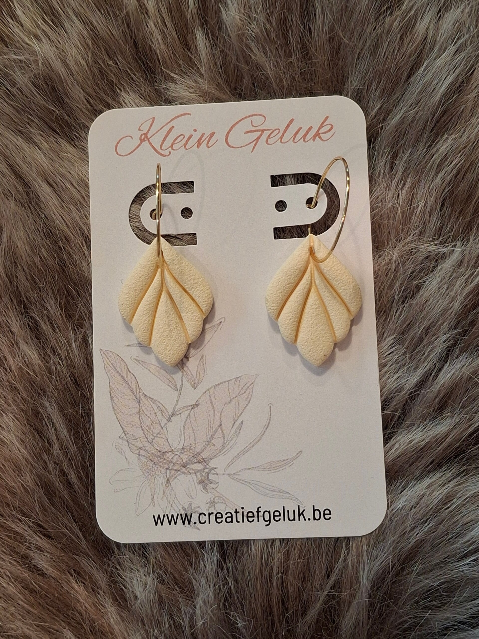 Deze elegante handgemaakte oorbellen zijn vervaardigd uit hoogwaardige polymeerklei en hebben een verfijnd bladmotief in een zachte ivoorkleur. De oorringen zijn van verguld stainless steel.