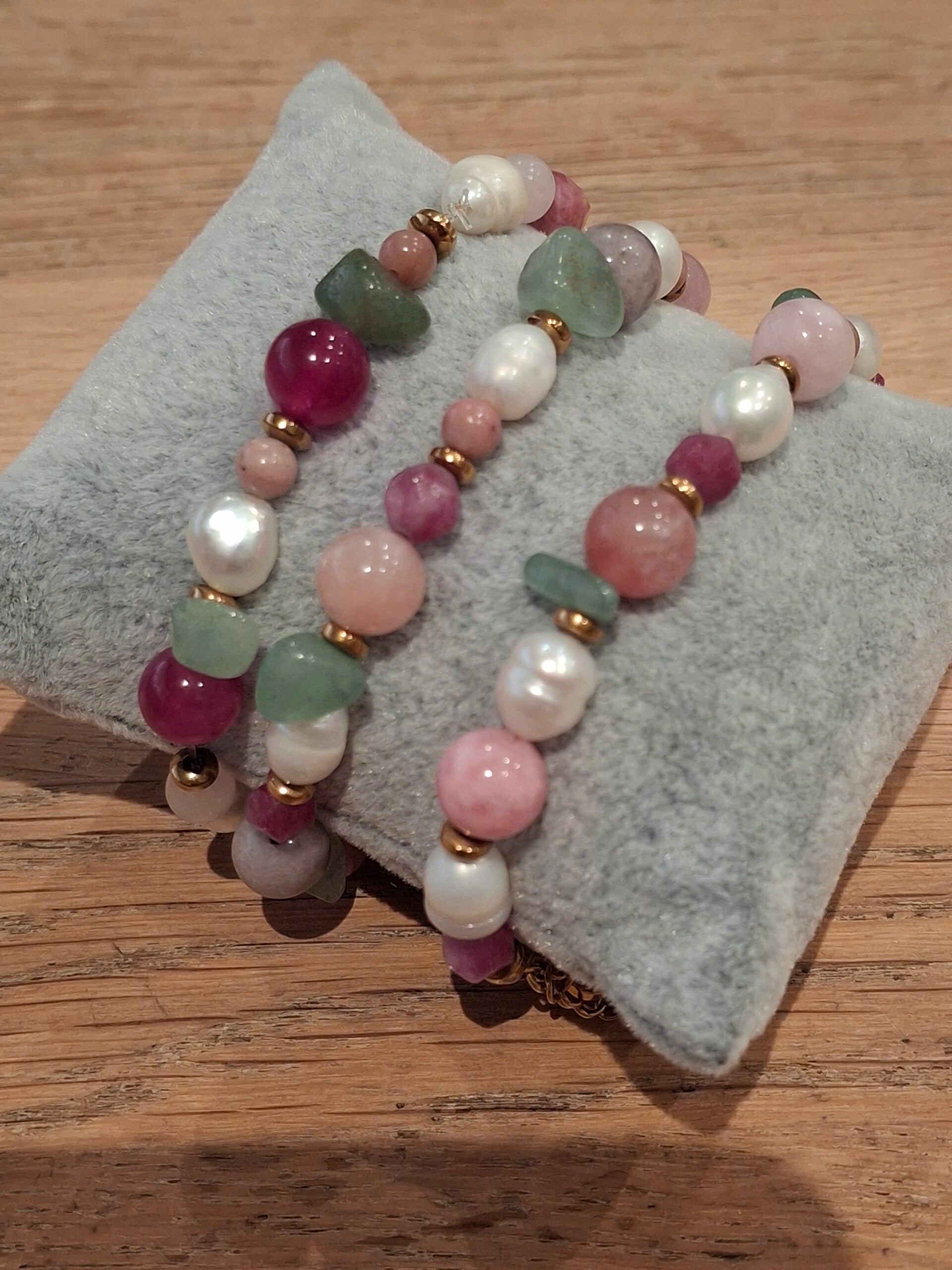 Prachtige armband met natuursteen en gekweekte zoetwaterparels. Afgewerkt met stainless steel gold plated kralen en slotje met verlenging.